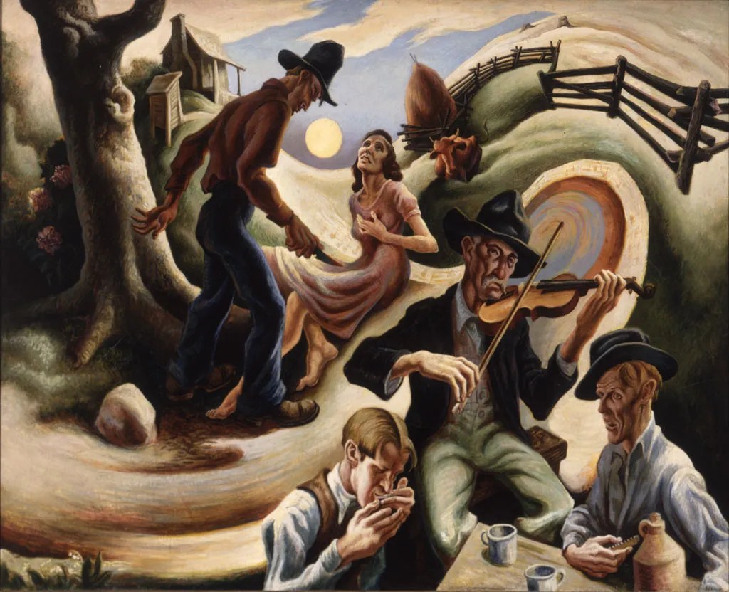 Devils also popularly appear in fiddle instrumentals. “The Devil’s Dream” [Hobart Smith, 1959] is representative of the longevity of British Isle melodies. It likely traces to the Scottish reel, “The De’il Among the Tailors”, meaning “devil” refers to the English board game of the same name. Nonetheless, early American performers of the tune often associated the song with being composed by the Devil. In southwestern Pennsylvania, the melody appears as “Satan’s Nightmare”, removing it from its board game origins.