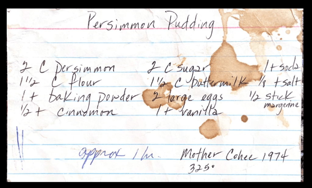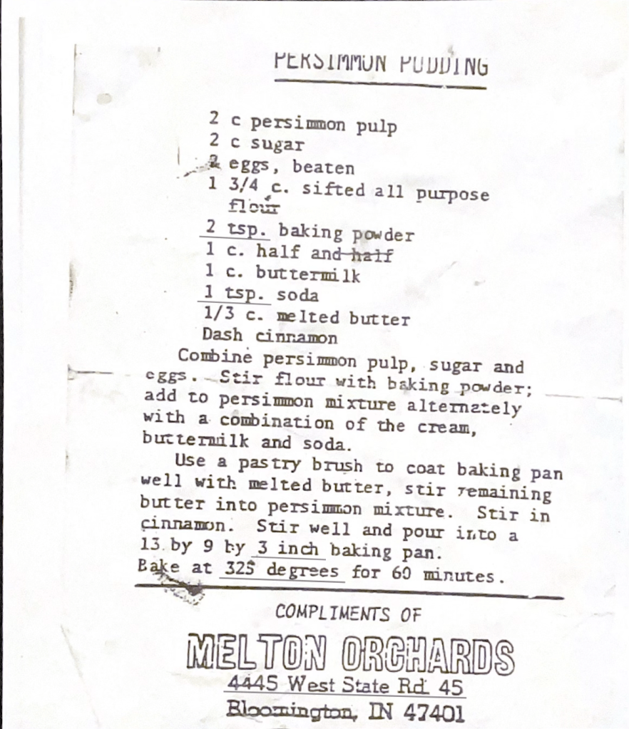 My own family’s collection of persimmon pudding recipes has led to a personal fascination with the ethnographic significance of the dessert. The families of close friends also have one or two persimmon pudding recipes they reference each Thanksgiving. Just 30 miles south of Bloomington, Mitchell hosts a persimmon festival every autumn, signifying how highly regarded persimmon pudding is.