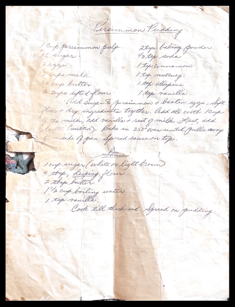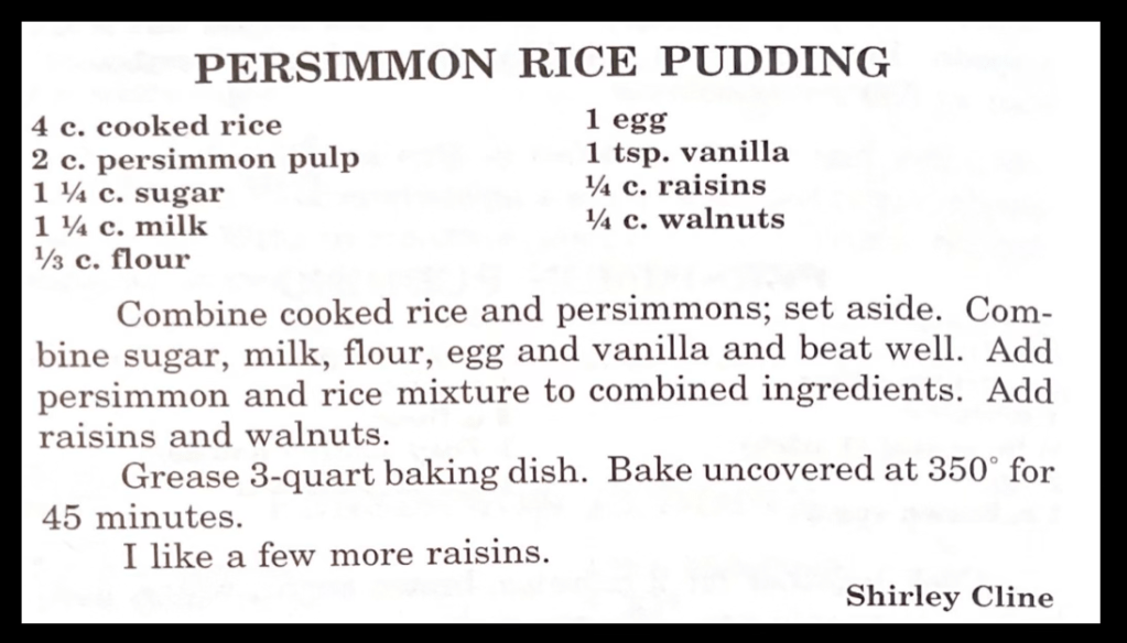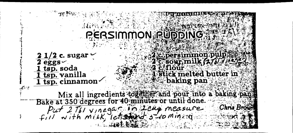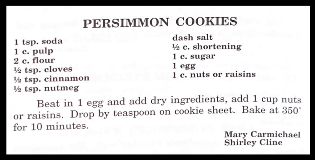 I wanted to take an opportunity to highlight the persimmon recipes in the collection. There is a surprising amount of variety. My great-grandma Cohee’s recipe is my personal favorite.