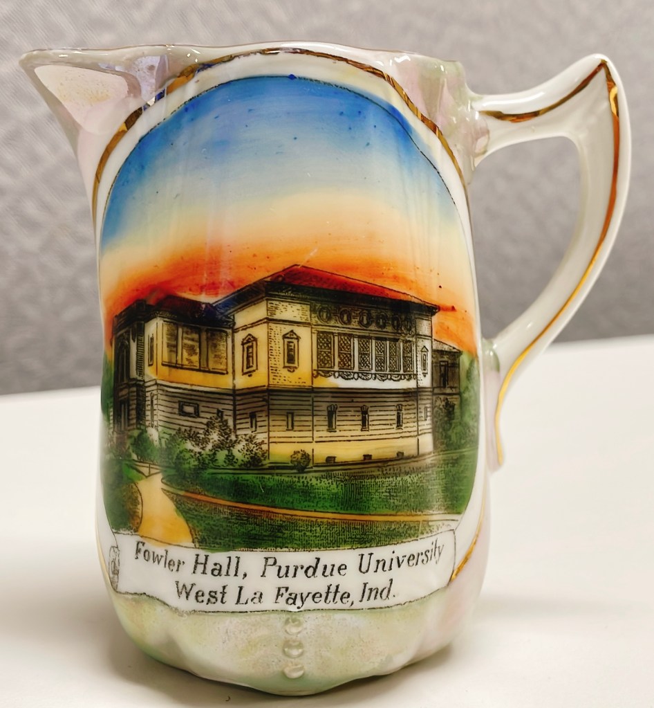 Few weeks ago I acquired this antique porcelain creamer depicting Purdue University’s Fowler Hall. It was imported by the Jonroth Studios for Deac’s Bookstore in West Lafayette, Indiana sometime between the 1910s and 1950s. Deac’s occupied the same building strip that Von’s Bookstore occupies today off of State Street. Funny enough, the transferring of ownership was actually quite contentious.