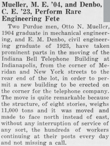 The Purdue and Vonnegut family connections do not end there. Several Purdue engineering alumni went on to work with Vonnegut & Bohn. “Dutch” Bruck started working with them in 1911 as a structural engineer. Most significantly, Class of 1904 Otto Mueller joined as a partner in the architecture firm, making it Vonnegut, Bohn, and Mueller. Famously, Mueller served as the architect for the state of Indiana in 1929 and shortly after led the relocation of the eight-story Bell Telephone building in 1930, which made national news.