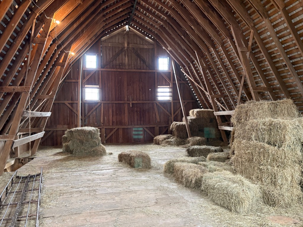 David, a local resident, was kind enough to share how he acquired one of these historic barns and what it means to him. At the intersection of W 660 S and S 475 W a handsome transverse, gambrel roofed barn sits on a concrete foundation. The barn was built in 1938 by J.H. Bone, an agriculture professor at the University of Oklahoma who moved to Tippecanoe County around 1898 to become a farmer. David eventually acquired the barn and continues to use it to house livestock and hay. The barn holds significant meaning, as it represents a tangible connection to the past and to a way of life. David shared that J.H. Bone harvested the interior wood for the barn after a tornado took out a grove of white oak trees, a high quality lumber. There’s resourcefulness in a lot of historic buildings, which are often built from local materials. In 2016, he submitted the barn to the Bicentennial Barns of Indiana project, which documented a list of 200 historic barns across the state. David’s barn was awarded a plaque.